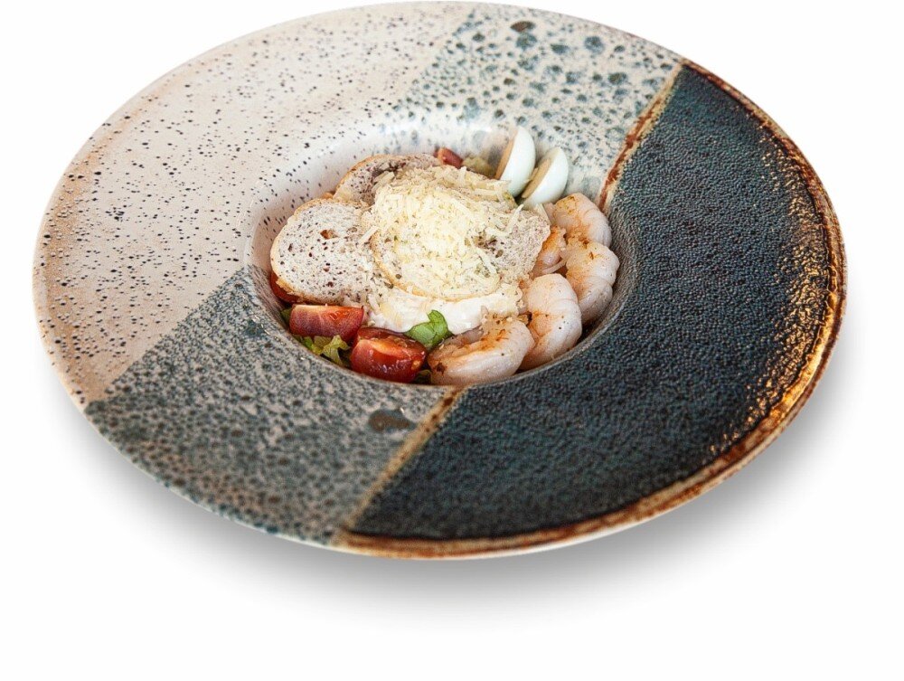 Микс салат, черри, креветки, перепелиное яйцо, соус Цезарь, сухарики.
